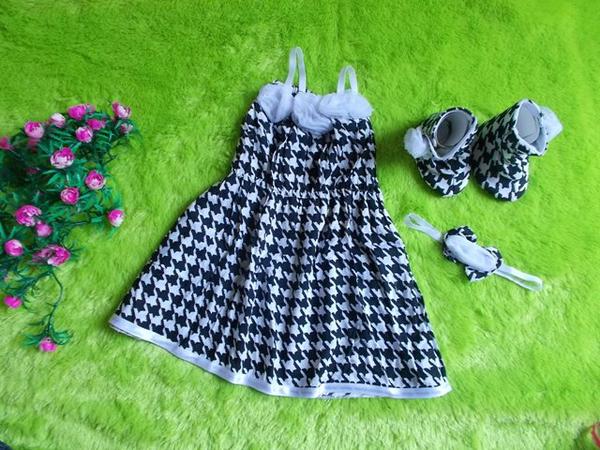 baju pesta bayi set dress bayi,sepatu boots prewalker,bandana cantik monokrom hits kekinia bahan adem